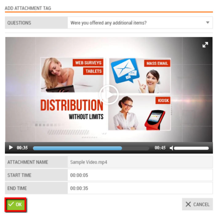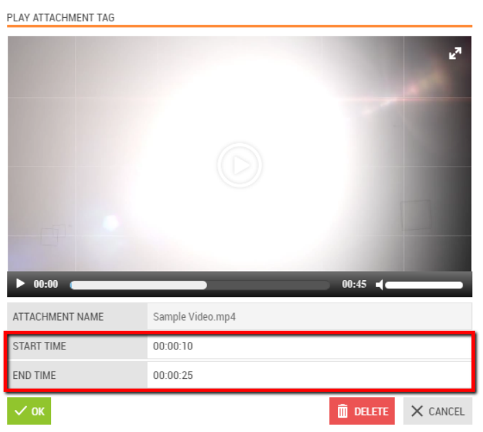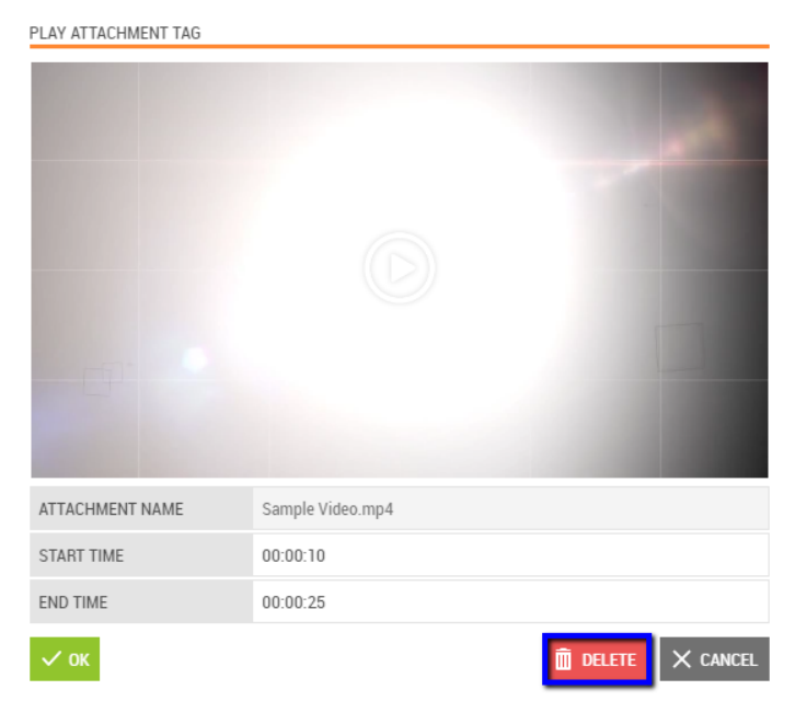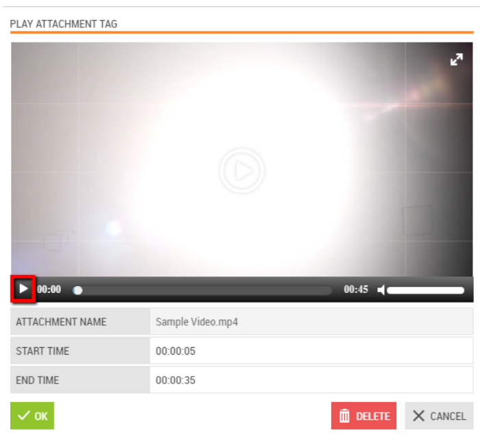 You can preview all Video Attachment Tags below the corresponding Question. After video tags have been saved you can Play, Edit or Delete them.